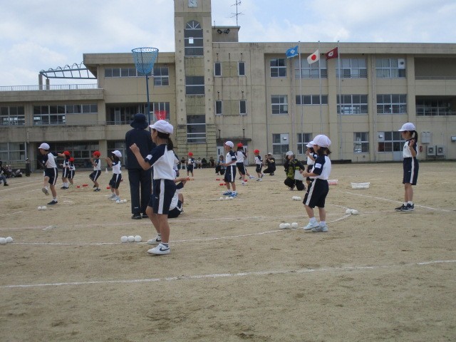 下学年の玉入れです。軽快にダンスを踊った後、ホイッスルの合図で玉を入れました。