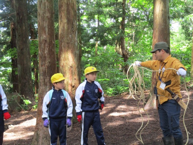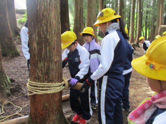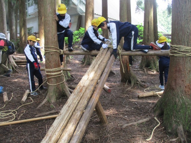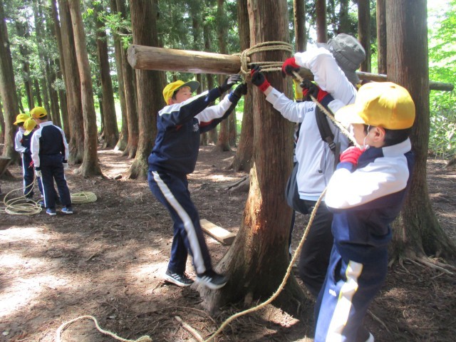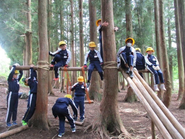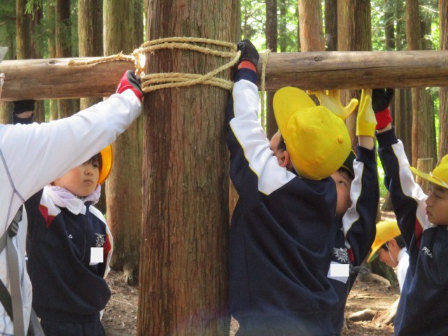 出発式、入所式を終え、森の遊び場作りを楽しみました。大きな丸太を協力して運び、ブランコや滑り台等、すてきな遊び場ができました。