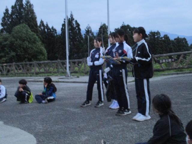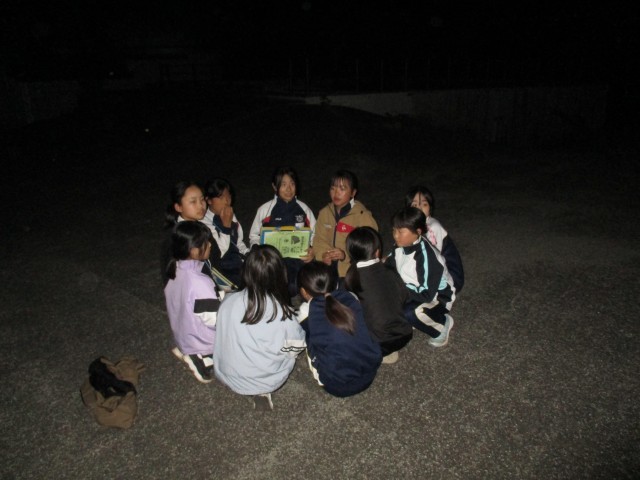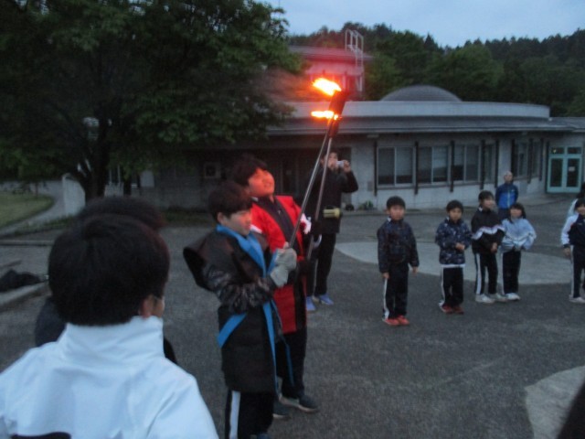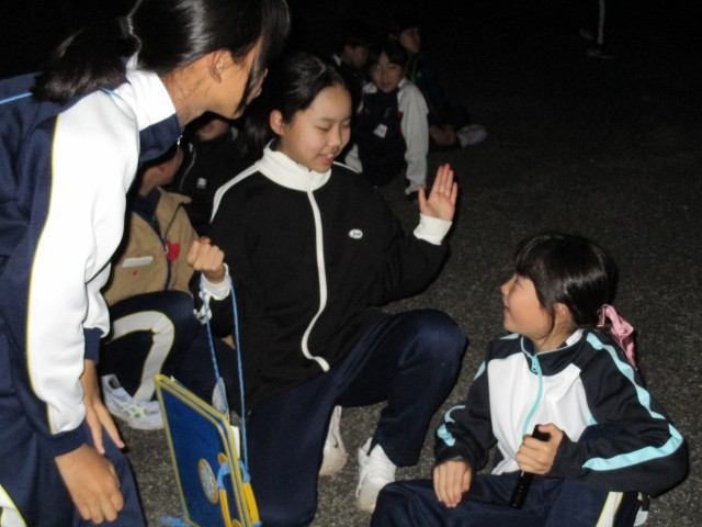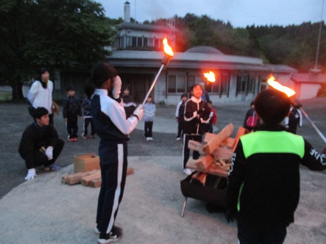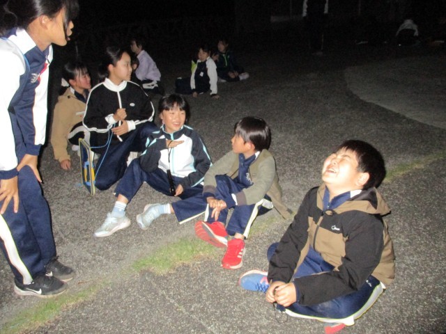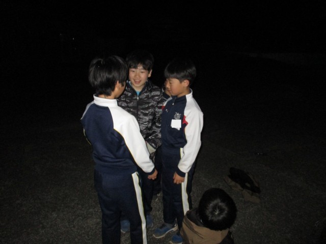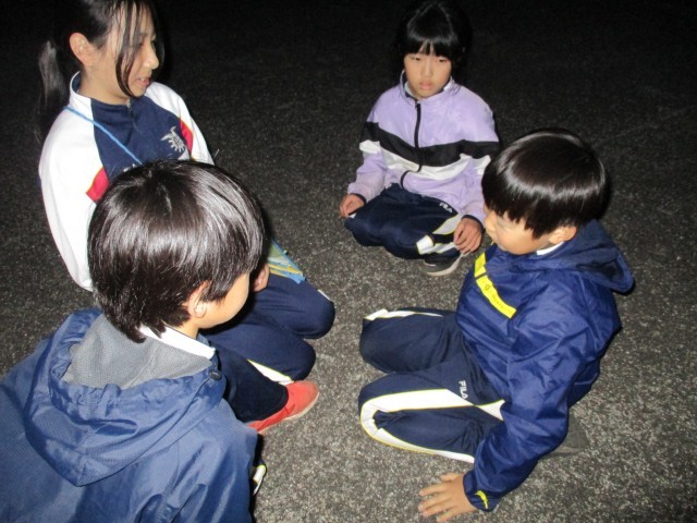 夕食をもりもり食べた後は、キャンプファイヤーをしました。だんだん周りが暗くなる中、みんなで楽しいゲームをして盛り上がりました。最後は、班で楽しかったことを伝え合いました。