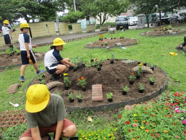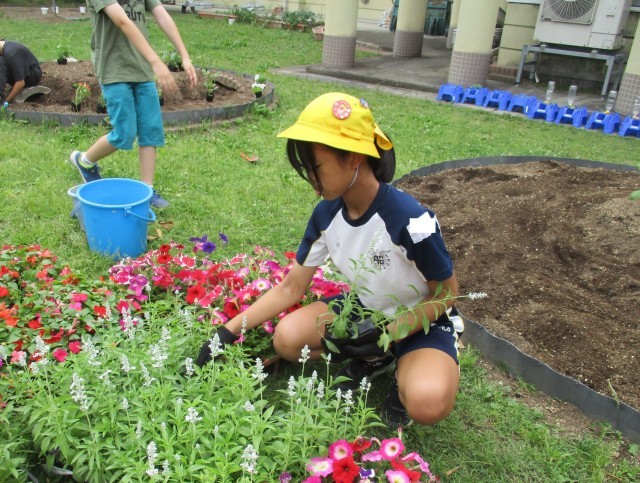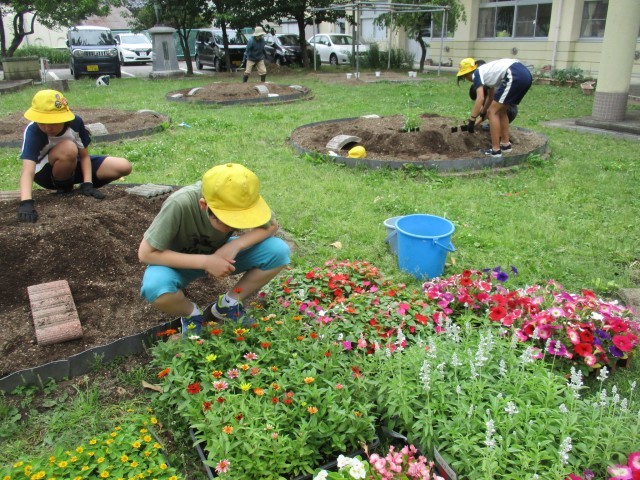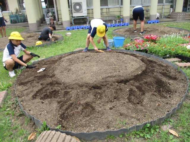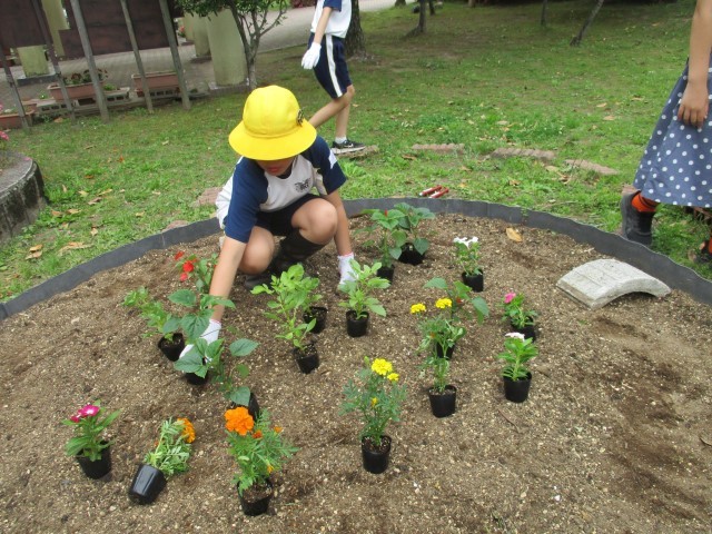明日の全校で植える花壇の準備をしました。土を整え、苗を運びました。どんな花壇にしたいのか思いをこめて並べました。