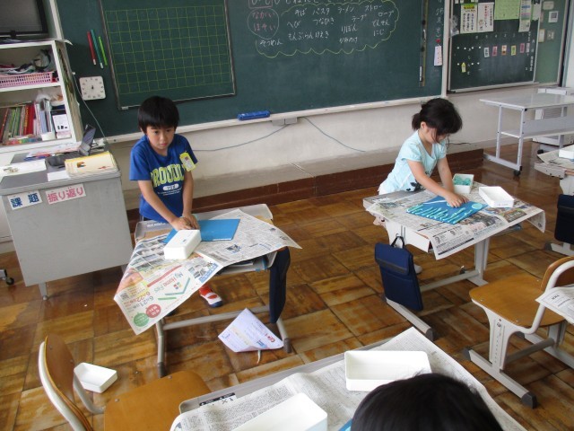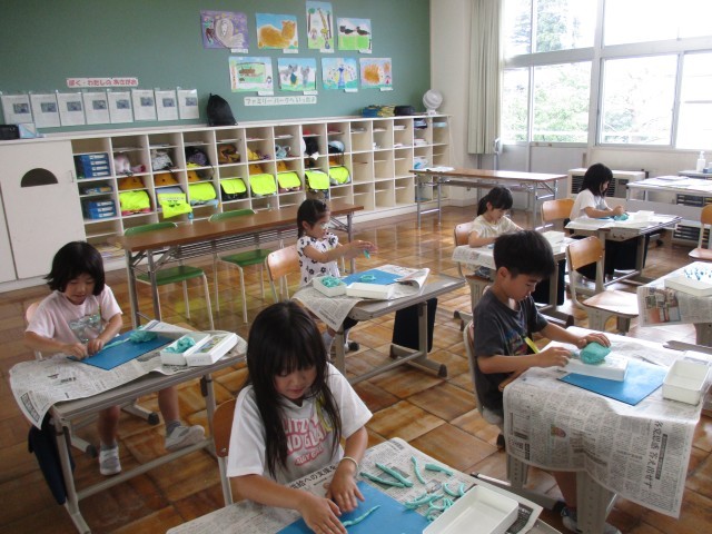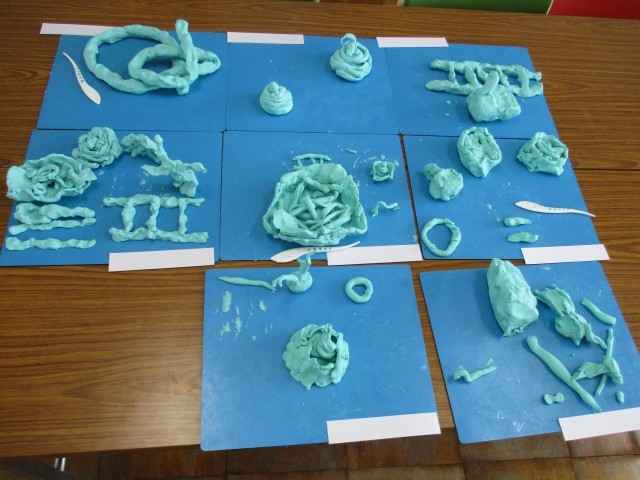 ひも状にした粘土で、思い思いの立体作品を作りました。
