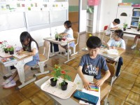 1・2年生の図工では、短冊や紙テープをつなげたりつるしたりして、造形遊びを楽しみ...