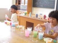 「おいしそう」と歓声をあげながら、カラフル色水づくりをしました。組み合わせた色に...