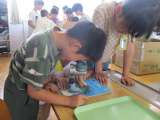 顕微鏡で大きくしてカイコを見せてもらいました。また、カイコが葉を食べる音を録音...