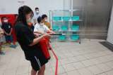 消火体験では、重たい消火器で火元に放水する体験を行いました。 地震体験では震...