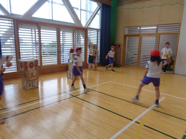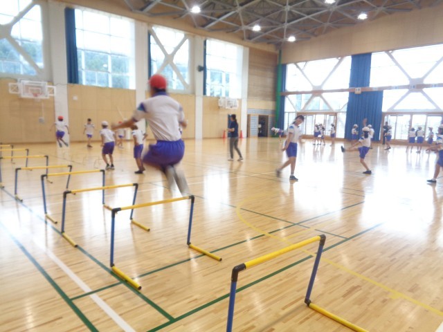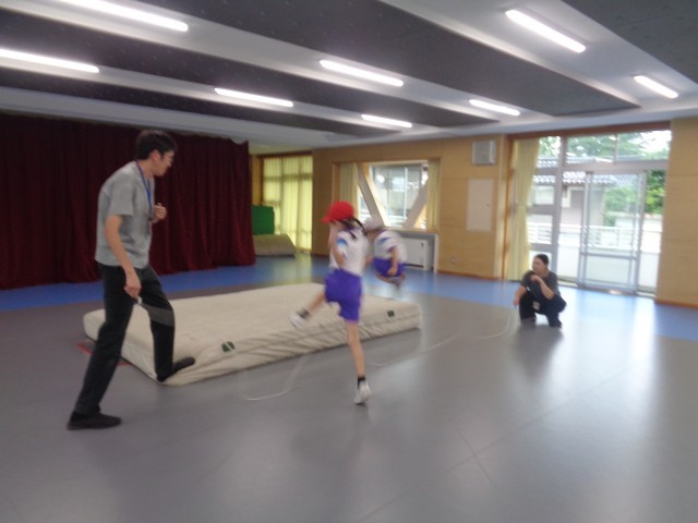 低学年は「跳ぶ」、中学年は「投げる」、高学年は「走る」の練習をしました。室内にもかかわらず、どの子も思い切り体を動かしていました。