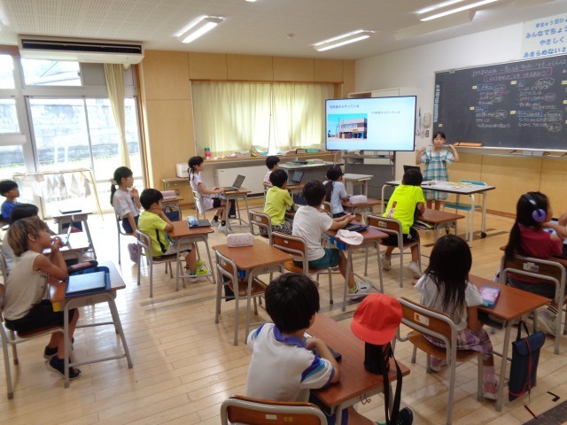 2年生の生活科では、まちたんけんに出かけた後、もっと気になるところを各自で調べ、スライドにまとめてきました。そして、今日はいよいよ発表の時間。それぞれの発表に、「ぼくも行ってみたくなった」「そんな昔からあるの?」等と感想をもったり、新たな疑問をもったりしていました。上滝の町について、ますます興味が湧いてきた子供たちです。