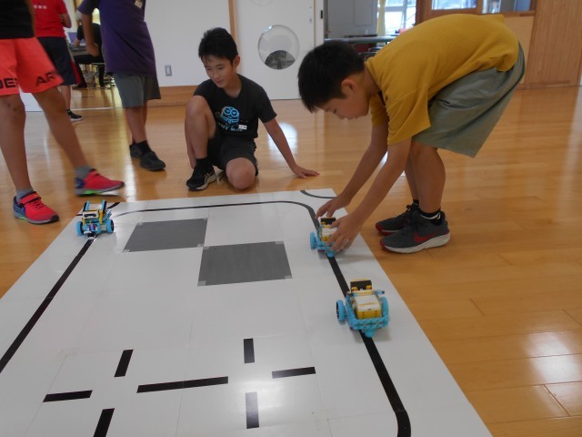 先週に引き続き、プログラミング教室を行いました。今回は、線の上を自動で走るロボットをプログラミングで動かしました。最後には、超音波センサーも活用し、車間距離を保ちながら走行するロボットを動かしました。トライアンドエラーで何度も挑戦し、楽しみながらプログラミングを学ぶことができました。