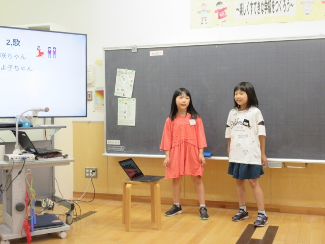今日は楽しみにしていた「1学期のお楽しみ会」でした。歌、劇、クイズ等、自分たちで考えた「出し物」を披露し、その後、「フルーツバスケット」と「椅子取りゲーム」をしました。また、今回は、運営も係ごとに自分たちで行いました。司会、プログラム、ゲーム係、始め・終わりの言葉等、みんなで内容を考えて仕事をしていました。プログラムと司会チームは、どのタイミングで話せばよいかと台本まで作っていました。それに、プログラムやクイズは、スライドで作っていて、びっくりしました。