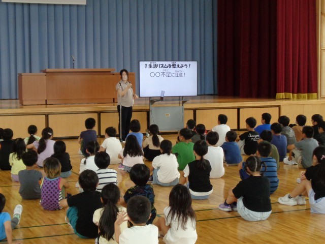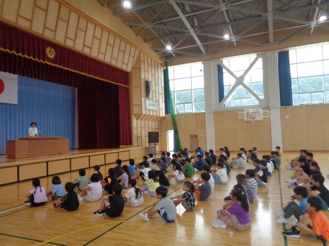 「2学期はどんな自分になりたいかを想像して、色々な活動をがんばりましょう」という校長先生からのお話しをみんな真剣に聞いていました。また、養護教諭からは、心と体を元気に過ごすために大切なことについての話がありました。