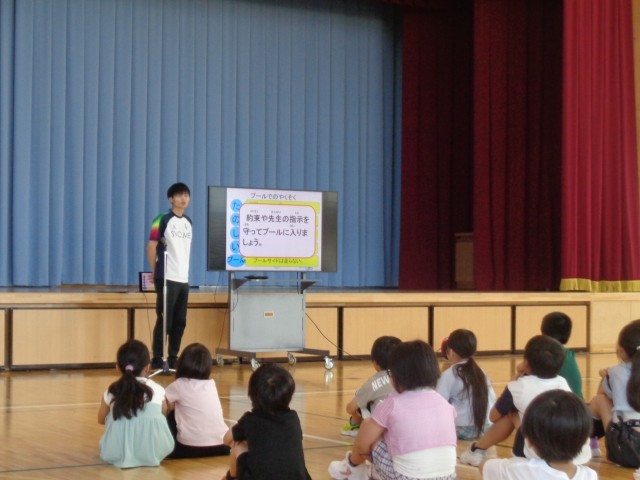 校長先生、体育主任、養護教諭から、安全に健康にプール学習をするために大切なことや、利用させていただく施設のルールについて確認しました。子どもたちはいよいよ始まる水泳学習を楽しみにしている様子でした。