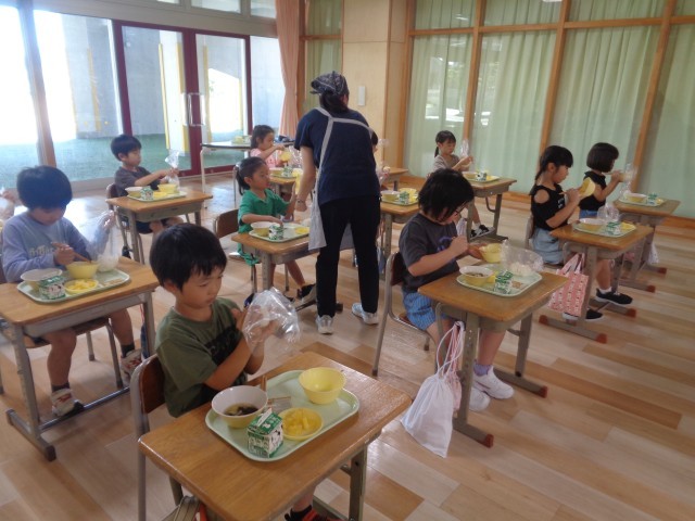 日持ちするフルーツ缶詰、高野豆腐の味噌汁とおにぎりのメニューでした。おにぎりは、白米とふりかけをビニール袋に入れて、自分で作りました。初めておにぎりを作る子も多かったようで、楽しそうに作って「いつもよりおいしい」「皿じゃないから洗い物へるね」等と話していて、防災について考える機会となったようです。