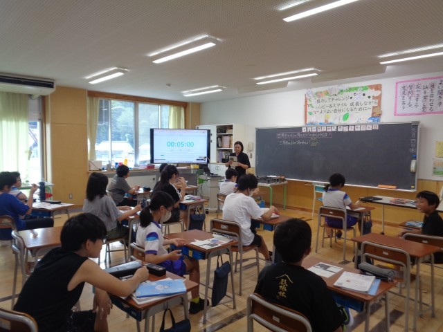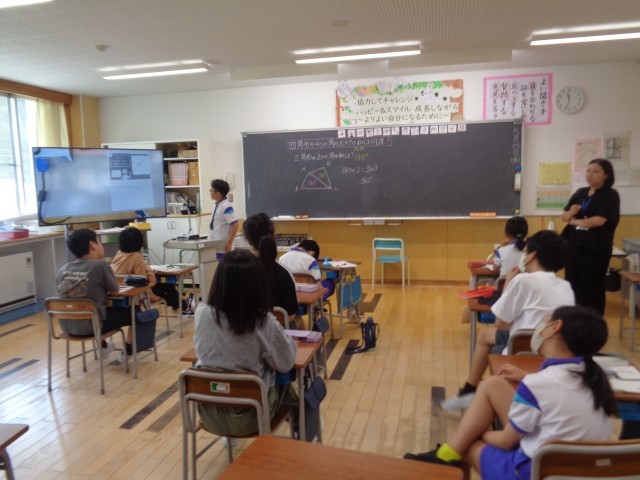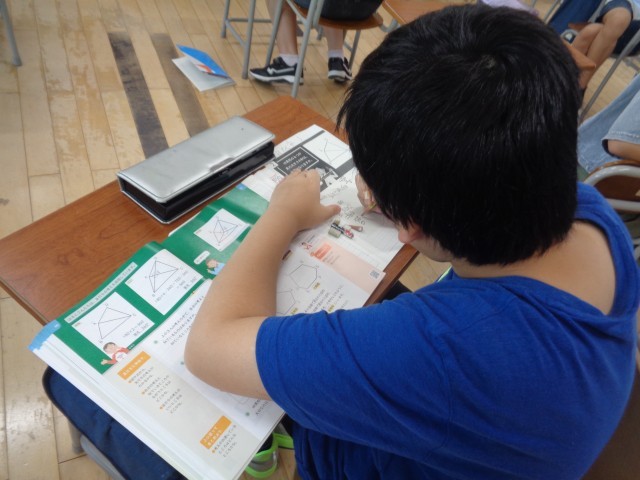 前回学習した「三角形の内角の和は180°になること」を生かし、四角形に線を引いて三角形に分けることで、4つの角の和は360°になることに気付くことができました。最初は考え方が分からない様子の子もいましたが、教科書を読んだり友達と相談したりしながら、真剣に取り組み理解することができました。