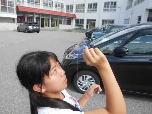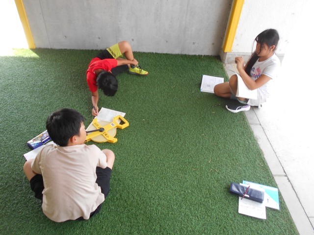 算数科「拡大図と縮図」の学習で、直接測ることのできない長さでも、縮図を書くことで求められることを学びました。そこで6年生は外に出て、校舎の高さを求めることにしました。分度器を使って角度を測る器具を作り、200分の1の縮図をノートにかいて校舎の高さを求めます。計算は少し難しかったですが、協力して取り組んでいました。