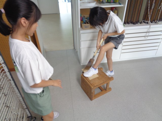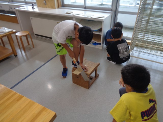 4年生は図工の時間に、のこぎりを使って木の板を切り、鉛筆立てを作っています。「全く切れない」「細いところ切るのが難しい」と、のこぎりで切る難しさを感じながらも、初めての経験を楽しみながら活動しています。