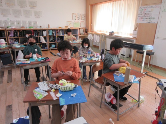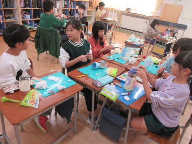 図工の時間に「空き容器のへんしん」の学習をしました。家から持ち寄った空き容器に紙粘土で飾りを付けていきます。子供たちは、自分のイメージしたものを思い思いに作っていきました。紙粘土に色を混ぜ、カラフルな貯金箱や小物入れ等、色々な作品ができあがってきました。学習参観のときに観ていただけると思います。