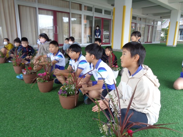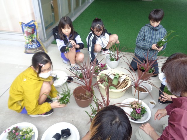 4年生は異世代交流学習として、花の寄せ植え体験をしました。講師の先生に植える花の特徴を教えてもらったり、実際に植える活動をしたりする中で、花に興味をもった児童がたくさんいました。「よい感じにできた」「高さが低い順番に並べることができた」と、自分がつくった寄せ植えをじっくりと眺めて、出来栄えを味わっている姿も見られました。