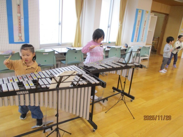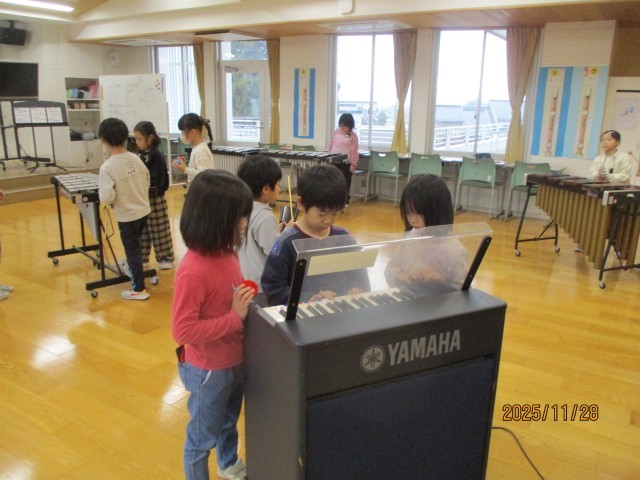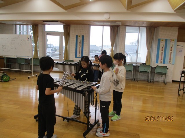 その後、グループごとにきらきら星の音づくりをしました。「悲しいきらきら星にしたいな」「楽しいきらきら星にするよ」「ミュージカルみたいなきらきら星にしよう」と、自分たちの思いに合った楽器を選び、演奏の仕方を考えました。