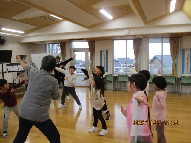 まずはダンスからスタート。学園天国の曲と子供の奏でるリズムに合わせてノリノリで踊ります。次に、全身でリズム遊びをしたり歌ったり・・・。その後、新しい歌を歌ったり「コロブチカ」を合奏したりと楽しい音楽の時間でした。