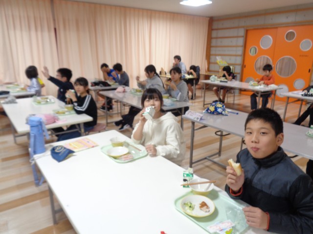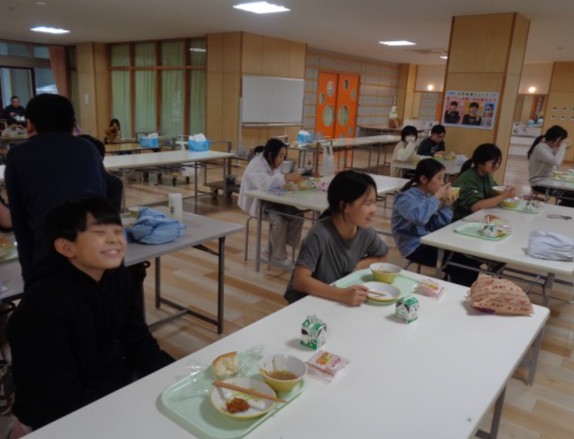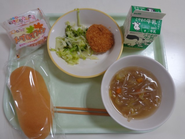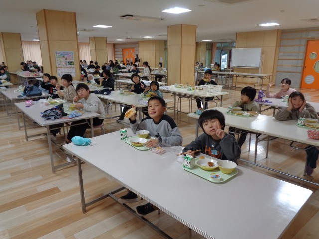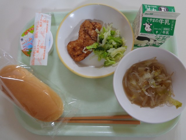 今日の給食は子供たちが待ちに待った選択献立でした。おかずは「えびカツ」か「豚肉のかおりあげ」、デザートは「りんごゼリー」か「メープルマフィン」でした。「何にした?」とそれぞれの献立を聞きあいながら、自分で選んだ献立の給食を美味しそうに食べていました。