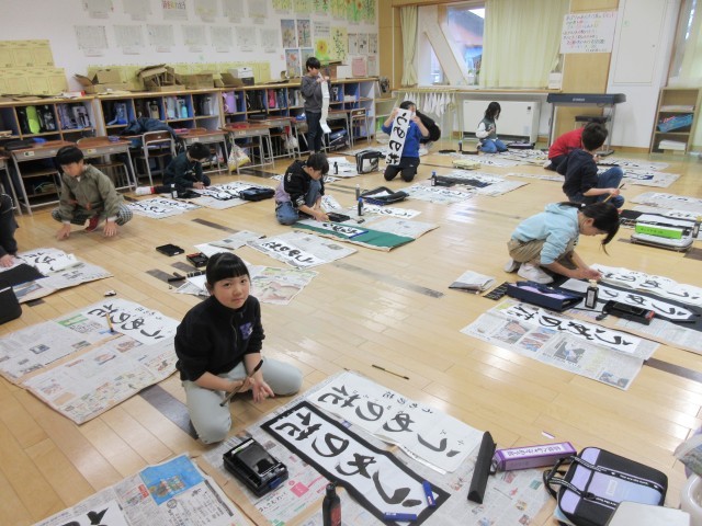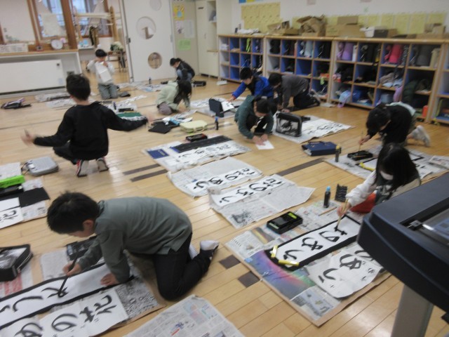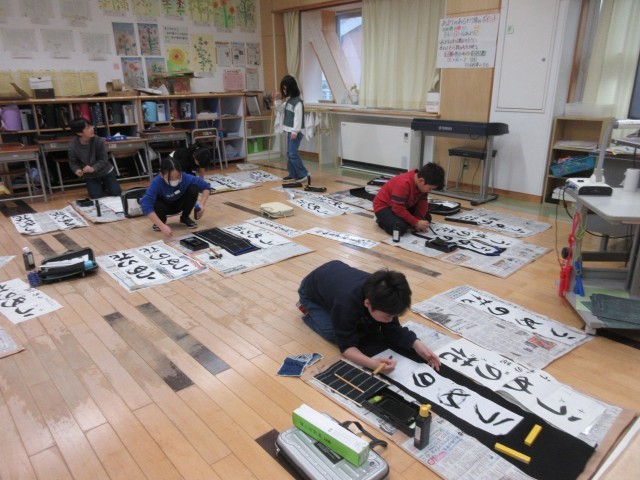 書初めの練習が始まりました。今日は2回目です。3年生は、初めて毛筆での書初めで、「うめの花」という言葉を書きます。ひらがなの「め」と「の」という文字は、筆の動かし方や曲がり、はらいが難しく、子供たちは何度も練習していました。