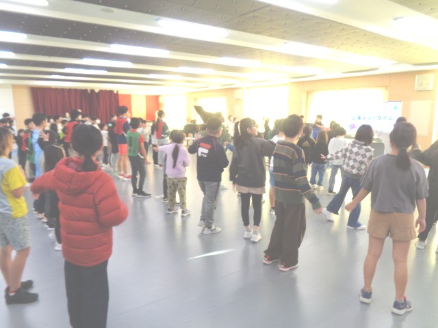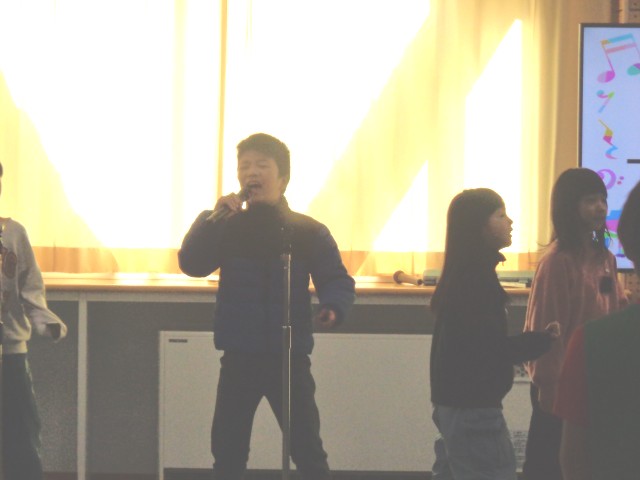 今日は2学期最後のなかよしハッピータイムでした。クリスマスソングに合わせてみんなでリズムアンサンブルをした後は、上滝ショータイム!2年生による「かねがなる」の輪唱や「コロブチカ」の合奏、3年生による「学園天国」の歌とダンスが披露されました。「学園天国」では、ノリノリな歌に合わせて全校みんなで踊りました。最後は「ふるさと」をみんなで歌い、教職員は合奏で参加しました。音楽が大好きな上滝っ子らしい2学期最後のなかよしハッピータイムとなりました。