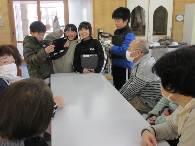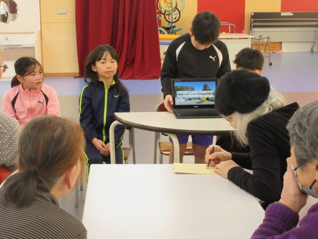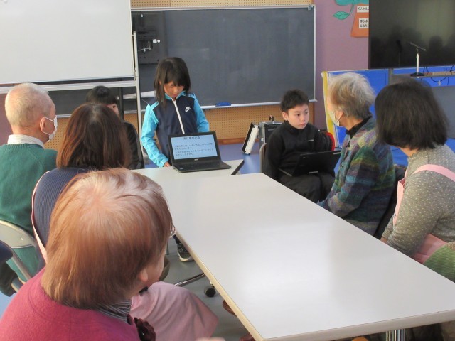 最初は、「にじ」の歌を発表しました。次に、総合の時間に学習した「富山市のすてき」を各自紹介しました。3つのチームに分かれて、各チームの司会者が進めていきました。早く終わったチームから、地域の方々に意見や感想を聞き、新たに教えてもらったこともありました。子供たちは、とても緊張したそうですが、和やかに話し合っている様子が感じられ、素敵な交流の時間になりました。