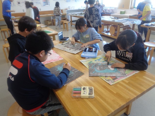 4年生は、図工の時間に版画をしました。彫刻刀を使って掘った板に版画用インクを塗り、紙にうつします。彫刻刀での彫りが甘いところは手直しをしながら真剣に取り組んでいました。「上手くできた。」と満足する声もあれば、「失敗した」と版画の難しさ感じる子供もいました。満足感が得られるように支援していきたいと思います。