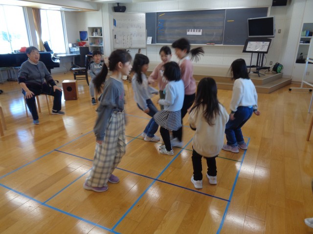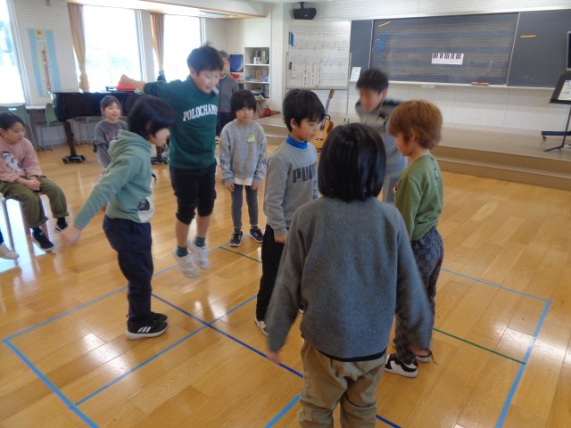 最初は音楽に合わせて、鬼と一緒のマスに入らないようにタイミングを揃えて移動するゲームをしました。つかまらないようにと、鬼は次どこに移動しそうか考えながら楽しく体を動かしていました。また、新春カラオケ大会に向けて「こころのうた」からの候補曲4つの中から1曲選選んで、練習をしました。のびのびと歌っており、とても素敵な歌声が広がっていました。さらに、その歌の曲調に合わせて楽器を演奏する子供もいました。本番では素敵な発表になりそうです。
