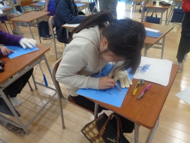5時間目の図工では、彫刻刀を使って木版画を作っています。カジキマグロ、スズメ、モモンガ、つるなどそれぞれ描きたい生き物を悩みながら選びました。どうすれば生き物の毛並みや躍動感を彫刻刀で表現できるかを考え、何度も修正しながら一生懸命取り組んでいる姿が印象的でした。