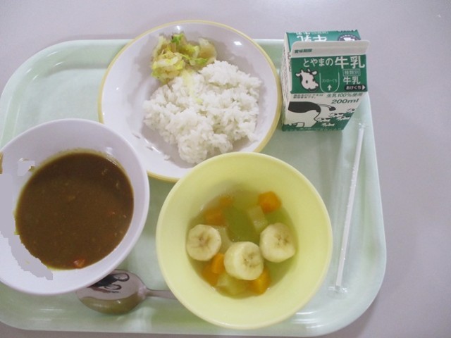 6年生はいつもより少し早めに給食を食べて、進学する中学校へ出かけます。おいしいカレーを食べてパワー充電!