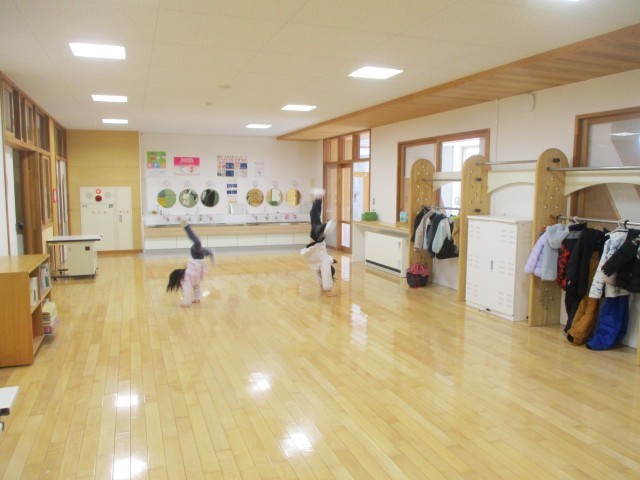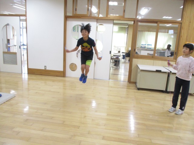 低学年のワークスペースでは、鉄棒や側転等を練習している子供がいます。今日は、先生に二重跳びの挑戦をしている高学年の子供もいました。