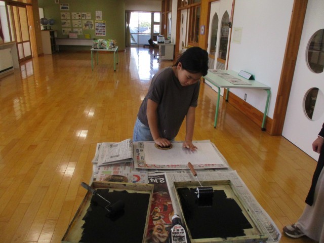 まずは、板を彫り進め、力強い黒で刷り上げます。仕上げは和紙の裏から色をのせます。すると、じわりと滲み出す柔らかな色彩が、木のぬくもりと重なり、幻想的な世界を作り出します。どの子の作品もすてきに仕上がりそうです。