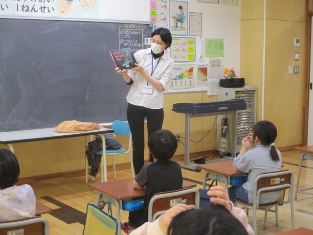 今日は大山図書館から司書さんが来て、1年生に読み聞かせをしてくださいました。まずは絵や文字を使わない、語りのみのお話から始まると、子供たちはすーっとお話の世界に入っていきました。それから「夜」にまつわる本を6冊読み聞かせをしてもらい、子供たちは前のめりになりながらお話を聞いていました。今日読み聞かせしてもらった本は1ヶ月間教室で読むことができます。子供たちは、「続きが気になる!」「もう1回読みたい!」と、本に夢中になっていました。