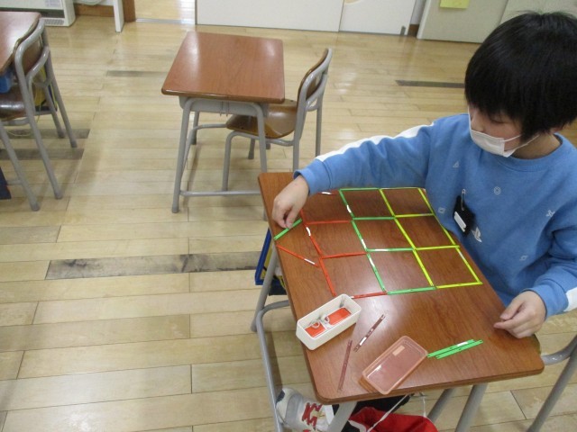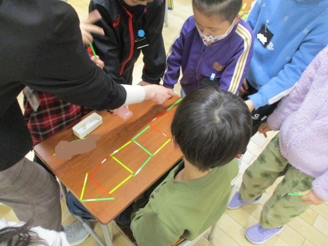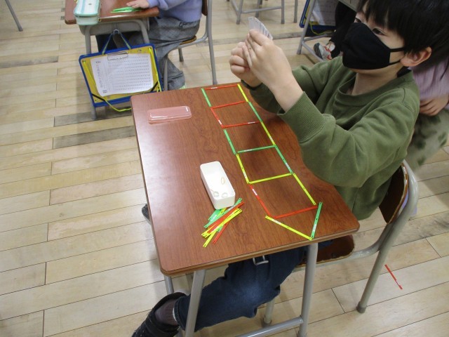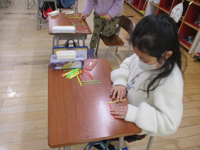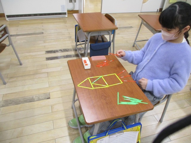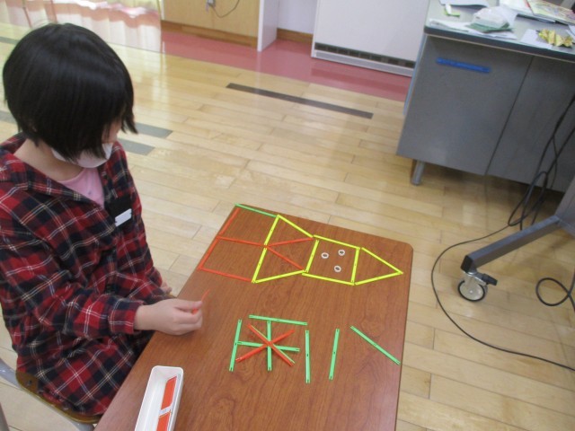 かぞえぼうを使って、三角形や四角形をつくり、それを組み合わせて思い思いの形をつくりました。