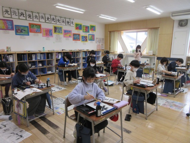 3年生になって、習字の学習が始まり、筆の使い方や片付け方もとても上手になりました。今日は、3年生のまとめとして、「水玉」を筆で書きました。今まで習った「左はらい」「右はらい」等もあり、子供たちも真剣に取り組んでいました。