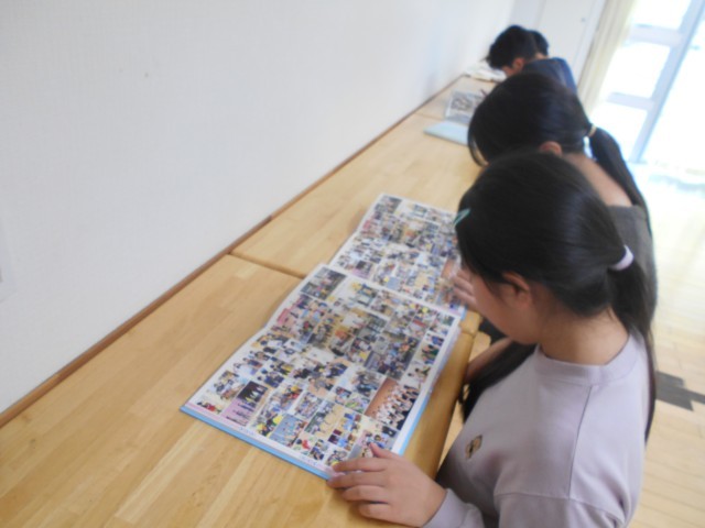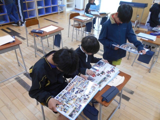 6年生に卒業アルバムを配りました。友達と一緒に1年生のころからの写真を見て自分たちの成長を感じていました。また、「中学校でもよろしく」など、アルバムに寄せ書きを書き合っていました。