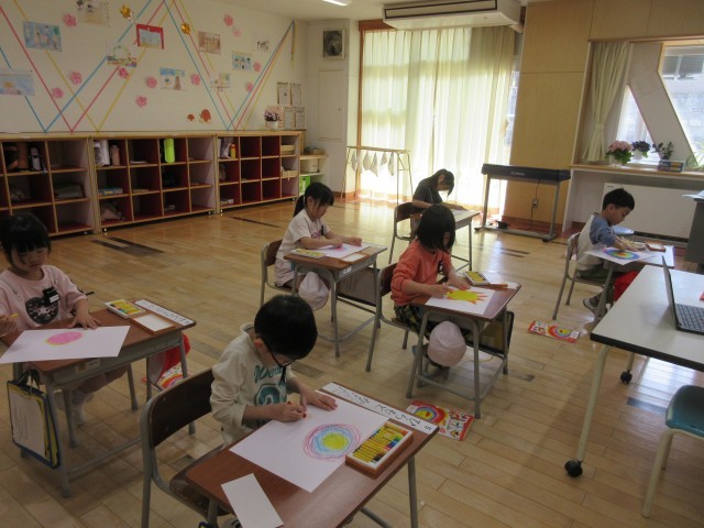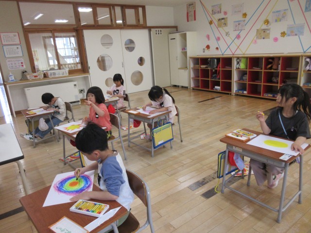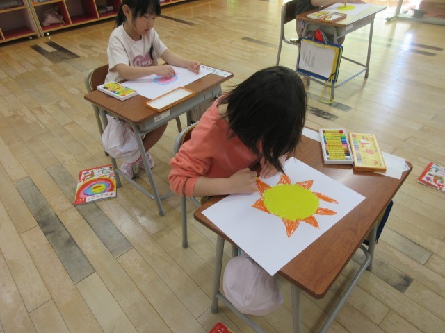 今日の図工の時間は、「わたしのおひさま」を描きました。にこにこ笑顔のお日様になるように、色や表情等を自分で考えて描きました。とっても素敵なお日様が出来上がりました。教室に掲示しておきますので、学習参観時にご覧ください。
