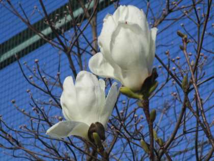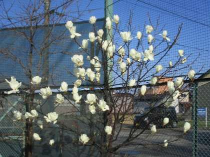 グラウンド北西の一本桜の横に、白いきれいな花が満開を迎えています。詳しい人に聞いたところ、「木蓮(もくれん)」だそうです。花の時期は短いようですから、学校近くに来る機会があったら、是非ご覧ください。