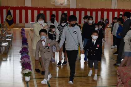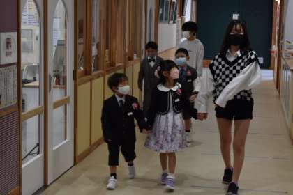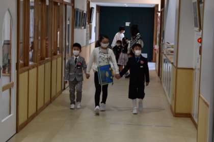 入学式を終えた1年生を連れて、6年生が校舎を案内しました。18人の1年生は3つの班に分かれ、それぞれに案内役の6年生が付いてくれました。中には突然校長室訪問を始める班もありましたが、お兄さんお姉さんが身近に感じられる良い機会になったと思います。
