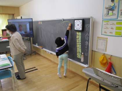 上の写真は、休み時間が終わったことを1年生に伝えてくれているところです。2枚目は、日直として責任をもって黒板を消してくれているところです。入学してからの1年間で、2年生に相応しい成長を遂げてくれたと思います。