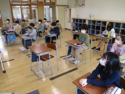 2時間目に6年生教室をのぞくと、授業に先立ち担任から、最高学年として過ごす1年間の見通しを伝えていました。6年生担任はつい先月に卒業生を見送ったばかりですから、聞いている児童たちも自分のこととして感じられていたようで、とても真剣に話を聞いていました。