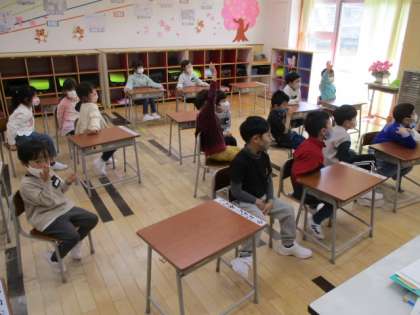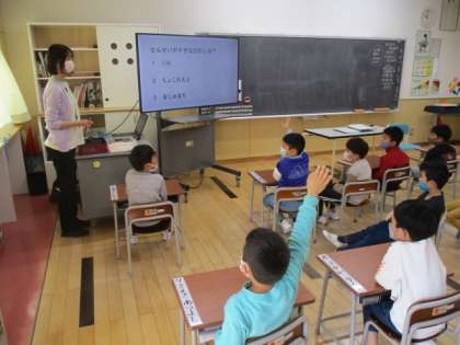 2時間目に1年生教室をのぞくと、担任の先生が「担任クイズ」を出しているところでした。クイズの問題は好きな食べ物で、グミ、チョコレート、マシュマロの三択問題でした。どの児童も本気で答えを見つけようとしていましたが、正解できたのは3分の1くらいだったと思います。