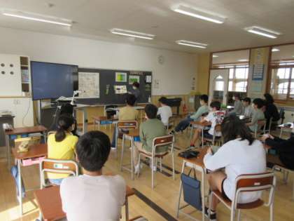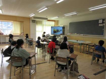 今日は、今年度初の読み聞かせの日でした。今年も地域のお話会の方々が読み聞かせのボランティアに来てくださっています。モニターに大きく映して、集中して聞くことができています。