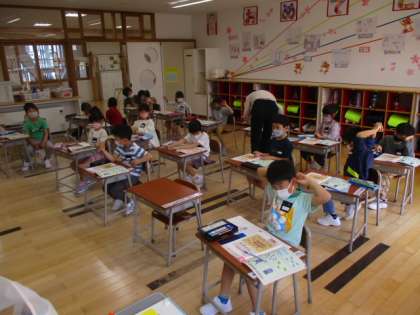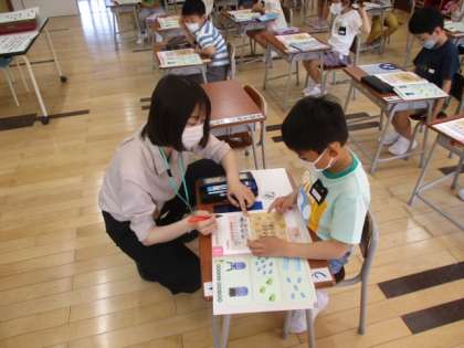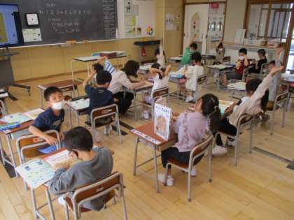 1年生の1時間目は算数の授業でした。教室をのぞいた時に取り組んでいたのは、数の学習でした。教科書の絵を見て、ウサギと一輪車の数のどちらが多いのか考えます。それぞれを線で結び1対1対応させることで多い方を見つけていました。