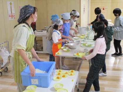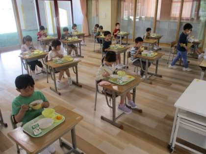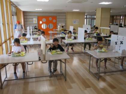 前の記事の続きです。1枚目の写真は5年生の配膳の様子。2枚目と3枚目はそれぞれ、1年生と2年生の食事風景です。