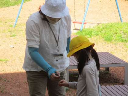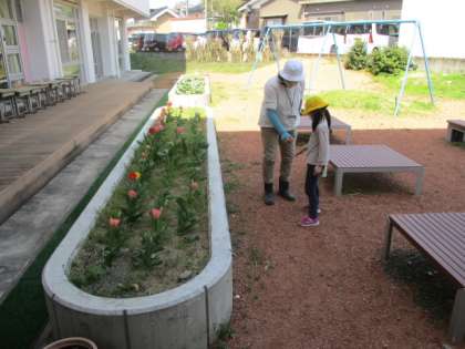 5時間目のひまわり級は、外へ出て花壇の整備だったのですが、思いもかけずトカゲが出てきました。先生の「触ってみる?」の声にうながされ、トカゲを持ってみました。