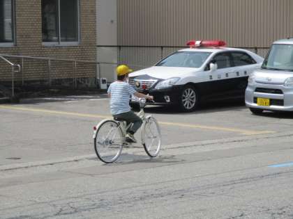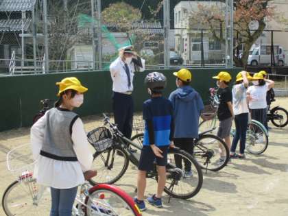 開校式の後、4年生はグラウンドに出ての実地訓練にのぞみました。お巡りさんから基本的なルールについて教えてもらった後、自転車の点検をしました。その際「ぶたはしゃべる」という点検のコツを教えてもらいました。「ぶ」は「ブレーキ」、「た」は「タイヤ」、「は」は「ハンドル」、「しゃ」は「車体」、「べる」はそのまま「ベル」だそうです。とても覚えやすかったです。