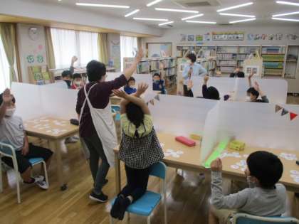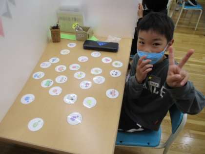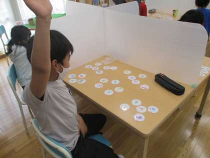 5時間目の2年生は、図書室でオリエンテーションを受けました。2年生の場合、机の上にカルタのように並べたカードを使い、ゲーム形式で図書の分類を習ったようです。元気よい2年生ですから、ゲームも盛り上がっていました。
