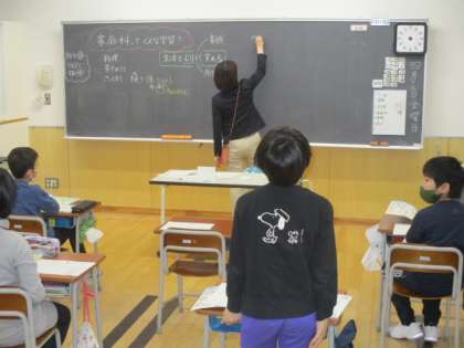 5年生の3時間目は家庭科の授業でした。今日の授業では「家庭科ってどんな教科」という学習課題を立て、そもそも何を学ぶ教科なのかについて考えていました。